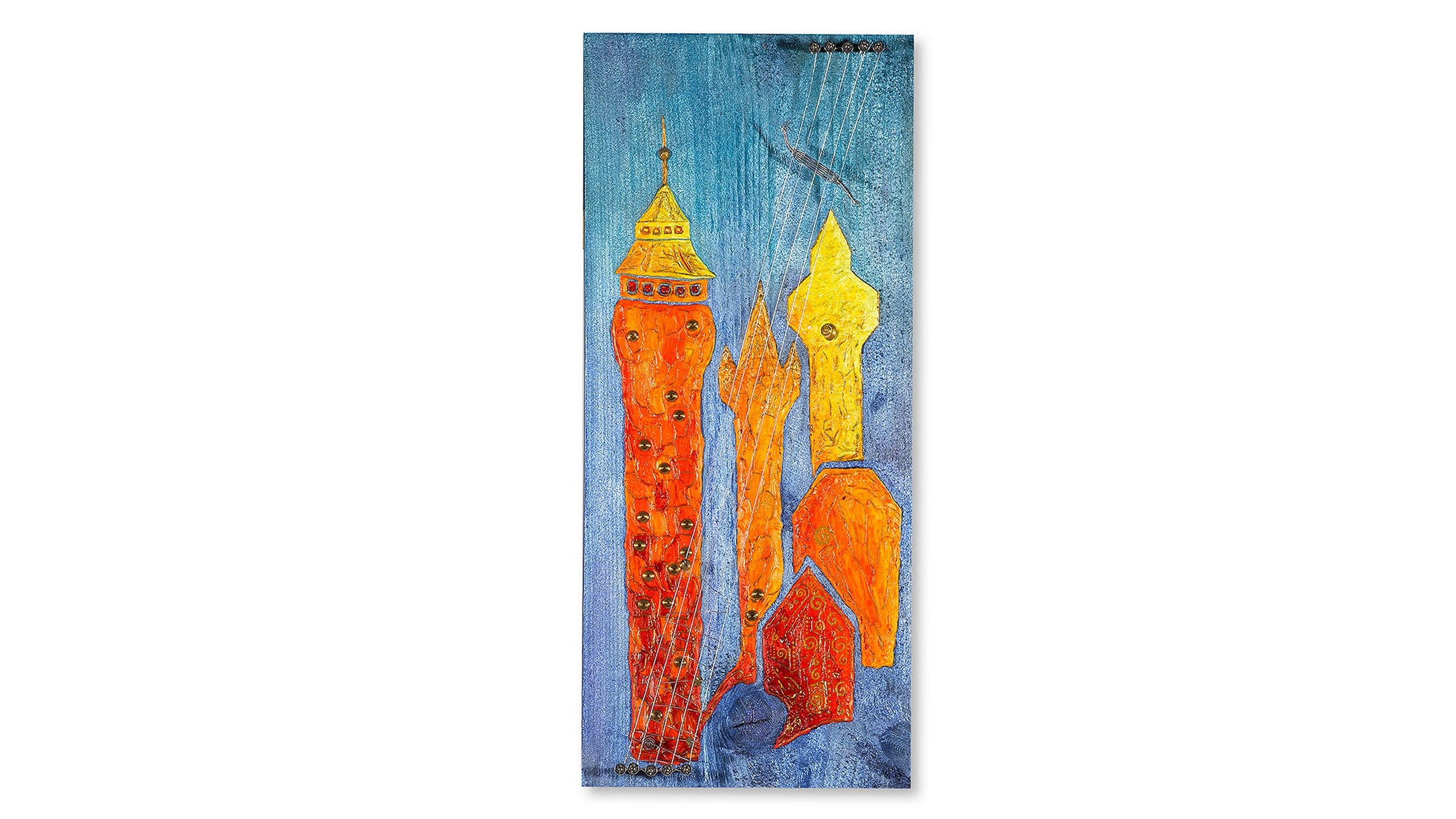 Bevorzugt lasiere ich die ungehobelten Dielenbretter mit Seidenmalfarben. So bleibt die Holzstruktur sichtbar erhalten und die Farben behalten auch nach starkem Lichteinfall oder auch im Freien sehr lange ihre Leuchtkraft. Objekte – wie z.B. gebrauchte Hartmetallschneidplatten aus der Metallbearbeitung werden aufgeschraubt und „in Form" gebracht, wie z.B. bei dem Salamander.